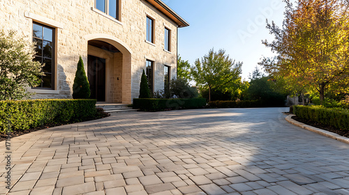 © photo for everything, Fototapeta premium Stone house with brick driveway and landscaped front yard, under a clear blue sky. Greenery contrasts with the building's facade and driveway.