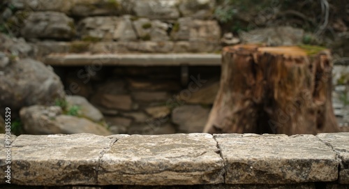 © Giovanni, Fototapeta premium Stone ledge foreground combined with rugged rock shelf and stump background