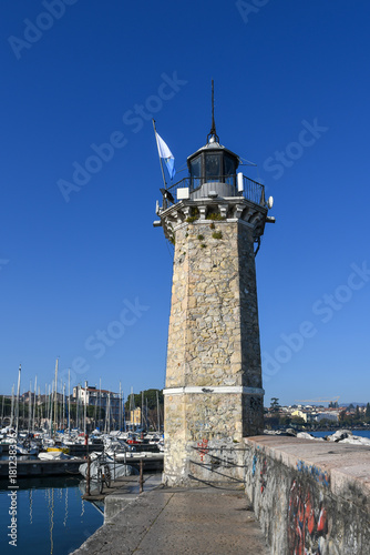 Fototapeta premium Stone lighthouse in Desenzano del Garda overlooking the marina, with boats,...