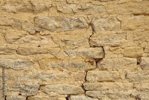 © Anna Studio, Fototapeta premium Stone masonry wall showing rustic texture and weathered surface with rough mortar joints, creating a strong background pattern