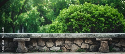 © vxnaghiyev, Fototapeta premium Stone park bench with green bushes in the background, perfect for a copy space image.