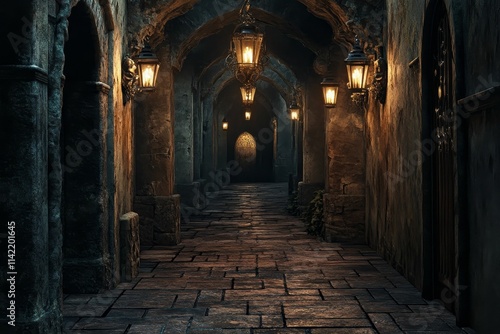 Fototapeta premium Stone passageway, lit lanterns, ancient architecture.