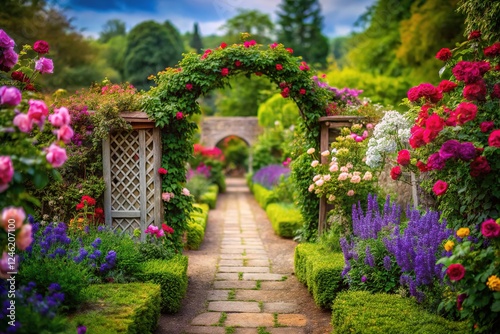 Fototapeta premium Stone path, hidden arbor, tilted English garden views.