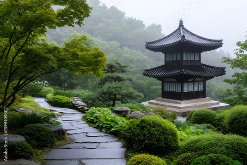 Fototapeta premium Stone path leading to a pagoda in a misty zen garden