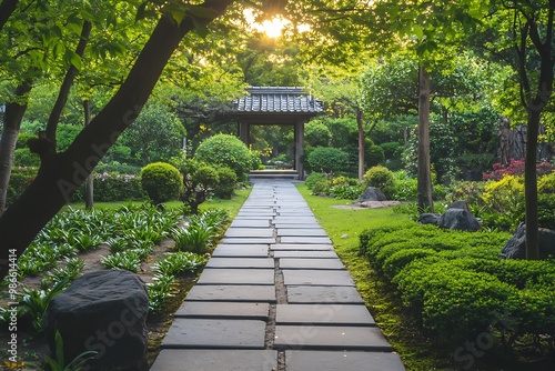 Obraz premium Stone path leading to traditional Japanese garden gate with sunset