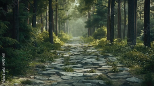 Fototapeta premium Stone path surrounded by tall trees in the forests.