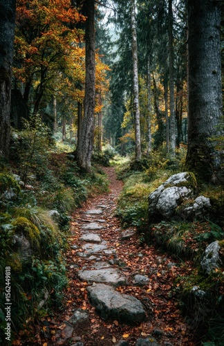 © yevgeniya131988, Obraz premium Stone path winding through a colorful autumn forest