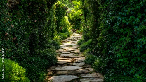 Fototapeta premium Stone path winds through a lush green tunnel of overgrown plants.