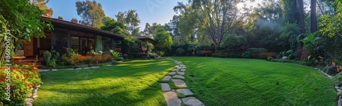Naklejka premium Stone Pathway Leading To Lush Green Lawn In Front Of A Brick Home On A Sunny Morning