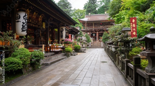 Fototapeta premium Stone Pathway Leading to Traditional Japanese Temple with Lanterns and Green...
