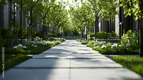 © Revin, Obraz premium Stone Pathway Leads Through Lush Green Trees And White Blossoms In Daylight Under Bright Sky