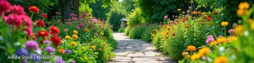 Fototapeta premium Stone pathway winds through lush summer cottage garden bursting with color , blossom, garden