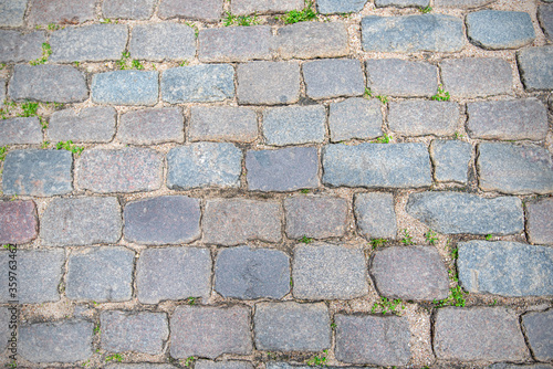 Fototapeta premium Stone pavement or road in old town as background, vintage cobblestone