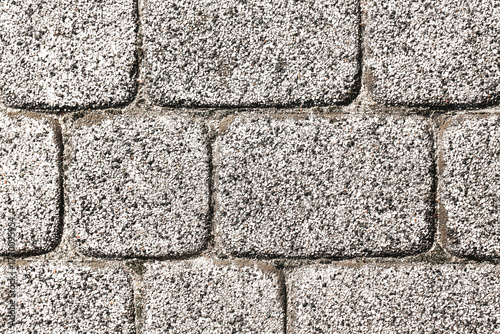 Fototapeta premium Stone pavement texture. Gray cobblestone surface background. Square stone pattern closeup. Urban architecture flooring. Natural stone block wall. Exterior outdoor construction material.