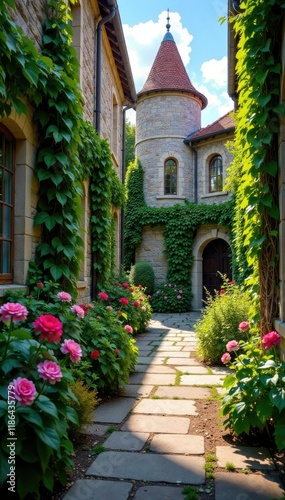 © สิริวุฒิ นาคโคตร, Fototapeta premium Stone pavement with vines and wildflowers in a secluded courtyard, castle, flower