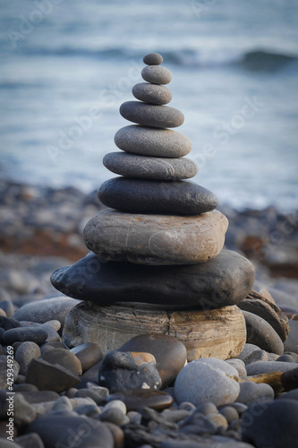 Fototapeta premium Stone piles made along a beach and the sea in the background. High quality photo