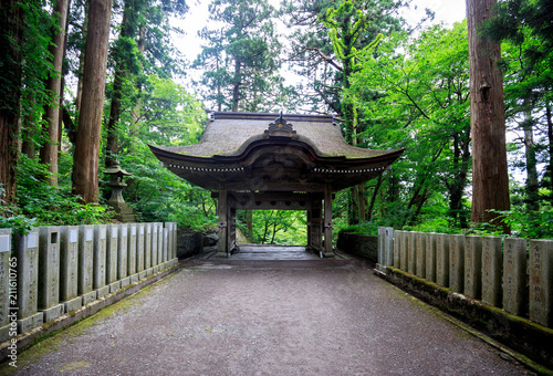 © Osaze, Obraz premium Stone pillars line walkway to Japanese wooden gate in forest