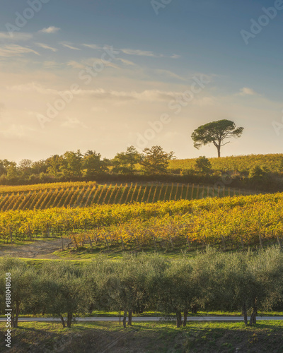 Naklejka premium Stone pine and vineyards, autumn landscape in Chianti region at sunset. Castelnuovo Berardenga, Tuscany, Italy