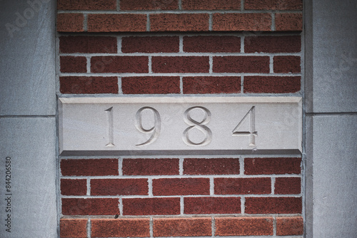 Fototapeta premium Stone plaque with 1984 engraving in brick wall