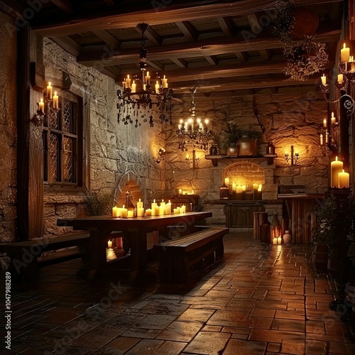 Fototapeta premium Stone room with candles, table, and benches.