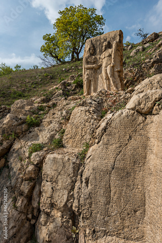 © Toyakisfoto.photos, Fototapeta premium stone sculptures of Greek deities with stone wall full of sculpted scriptures on the foothills of the Mountain of the Gods