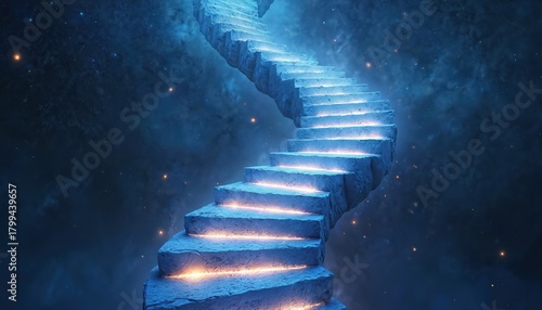 © miss irine, Obraz premium Stone stairs ascend into starry night sky, glowing steps lead into cosmos. Concept for evolution, progress, spiritual journey, inspiration, or future tech.
