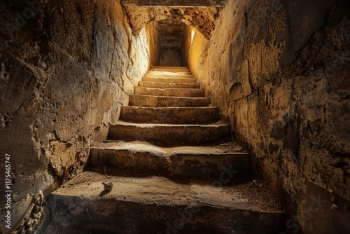 Obraz premium Stone steps ascending from darkness towards a light source in a mysterious, ancient structure