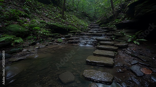 © mikail, Obraz premium Stone steps crossing a small stream surrounded by lush forest vegetation