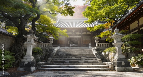 © Faha Studio, Obraz premium Stone Steps Leading to Asian Temple Entrance with Lush Greenery and Sunlight