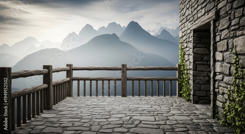 Fototapeta premium Stone terrace overlooking misty mountains