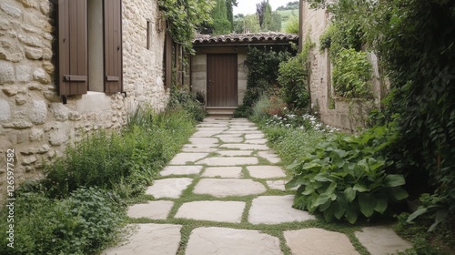 © musa, Obraz premium Stone walkway through a rustic courtyard garden