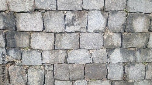 © Ade, Fototapeta premium Stone wall pattern. Old castle stone wall background. Part of a stone wall, for background or texture. Seamless background texture with different sized stones. Isolated grey stone wall.