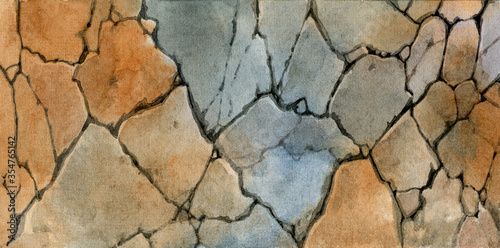 Fototapeta premium Stone wall. Stone texture drawn in watercolor. Stone wall with cracks. Beautiful watercolor illustration.