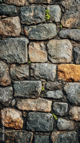 © Color Emotion, Obraz premium Stone Wall Texture with Small Plants Growing in Between Blocks
