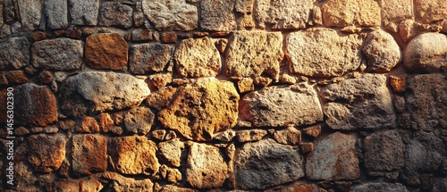 © Koplexs-Stock, Fototapeta premium Stone wall texture with sunlight creating shadows and highlights on the surface.