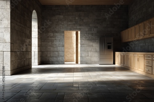 © free, Obraz premium Stone walls and wooden cabinets form a modern kitchen with bright sunlight.