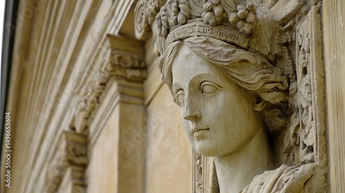 Obraz premium Stone Womans Bust with Building Facade.