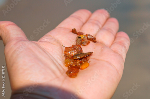 Fototapeta premium Stones of amber of the Baltic sea. Amber on a palm.
