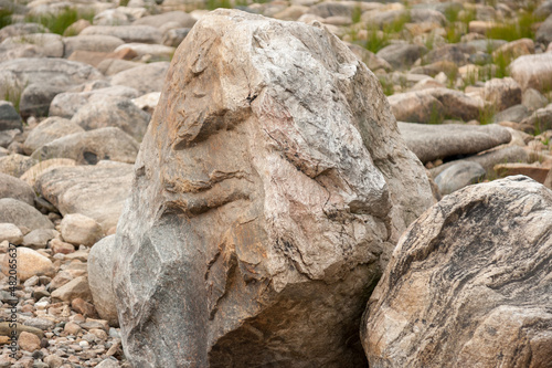 Fototapeta premium Stones on shore of lake in summer, Karelia, Russia