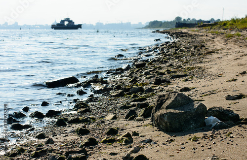 Fototapeta premium Stones on the beach line (coast) river, and ship (ferry boat) on the background