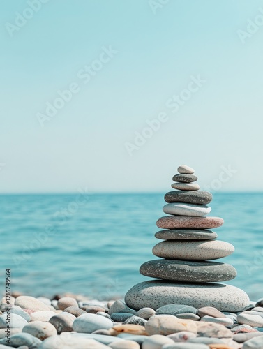 Fototapeta premium Stones stacked on beach shore, symbolizing tranquility and mindfulness.