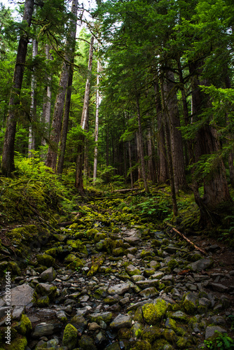 Obraz premium Stony creek-bed blanketed in moss among towering pines. Olympic National Forest