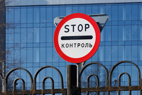 © Yuriy Afonkin, Obraz premium Stop control road sign. The word "control" is written in Russian.
