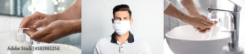 © New Africa, Fototapeta premium Stop coronavirus spreading. People wearing mask and washing hands to prevent contamination, banner design