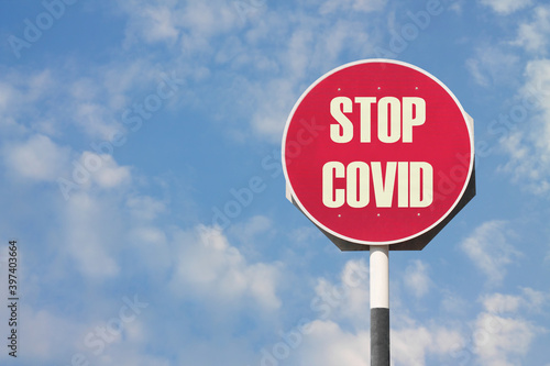 Obraz premium Stop Covid Sign on Red Post