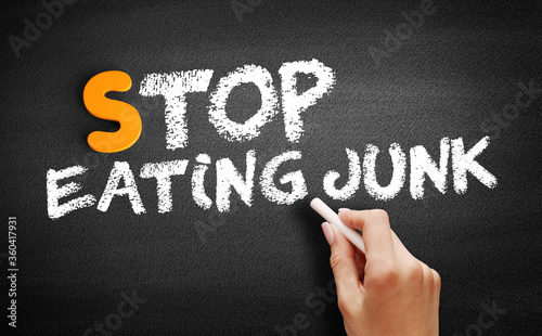 © dizain, Fototapeta premium Stop Eating Junk text on blackboard, concept background