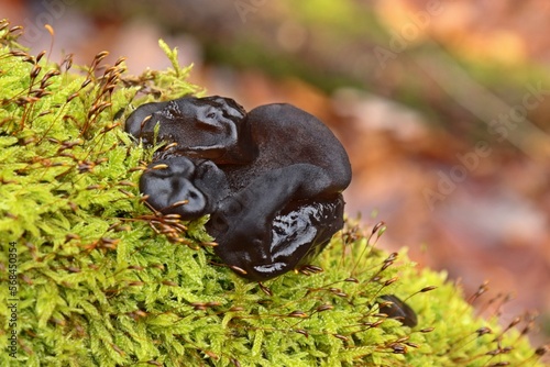 © Schmutzler-Schaub, Obraz premium Stoppeliger Drüsling (Exidia glandulosa) auf bemoostem Ast