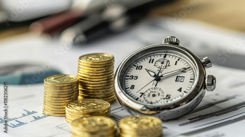 © whitestorm, Fototapeta premium Stopwatch and gold coins on business documents