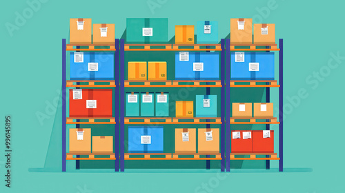 Fototapeta premium Storage Hub, a vibrant flat design illustration showcasing neatly labeled goods organized on shelves within a modern storage facility, emphasizing efficiency and order.