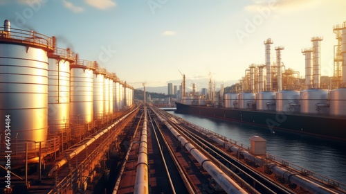Fototapeta premium Storage tanks for oil and gas refineries Industrial structures and giant tanks nearby.
